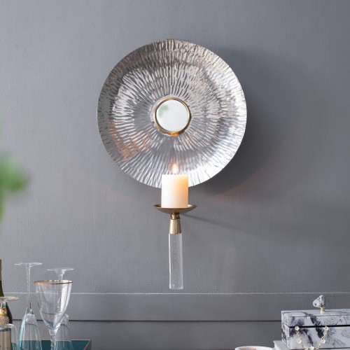 - Elegant Design: The Maria wall sconce features a circular wall mount with a radial design, providing a modern touch to any interior space. Its circular candle plate enhances the ambiance by illuminating the room stylishly.
