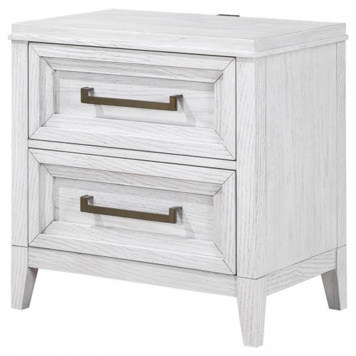 Bring fresh perspective to your bedside with a modern two-drawer nightstand. Its casual style and classic stance create a restrained look and feel, perfect for a soothing bedroom space. It features a distressed white finish over wood grain, creating subtle depth and detail. Drawers are roomy for bedside essentials, and stepped fronts add character and dimensionality. Contrasting antique brass toned bar pull complete the look, offering stylish allure in your stylish bedroom.