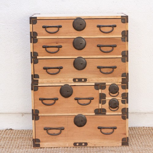 This impressive Antique Tansu chest is a rare and powerful piece of functional history. Known as a “chest-on-chest” or Kasane Tansu, this style was traditionally used in Japan during the Meiji period (late 19th Century) for storing kimono and household valuables. Its structure, designed for easy separation and transport, speaks directly to the social mobility of the era. The natural, light wood finish contrasts dramatically with the heavy, original iron hardware, including large circular drawer plates and corner guards, which were essential for durability and often symbolized family crests.