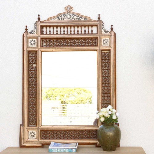 This very decorative Middle Eastern mirror features a crown shaped top and intricate wooden Mousharabi lattice and spindle designs on each side of its frame. Ornate and geometric patterns made using inlaid pieces as well as intarsia inlays embellish the frame making this piece an elegant art form. One spindle has been replaced; slight blemishes.