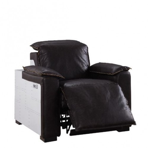A perfect mixture of industrial style and comfort. The Nernoss Power Motion Recliner is accented by dark grain brown leather and aluminum patchwork for a complete industrial look. It features tight seat and back cushions and offers a full foam seat with pillow top armrests, giving user a warm touch and perfect feeling. You will love the pure aesthetics and textures of industrial style design.