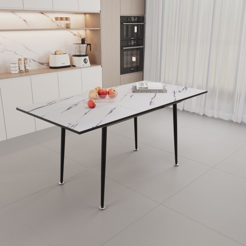 Modern Industrial Expandable Dining Table 47″ To With Marble Pattern Top And Metal Legs – White