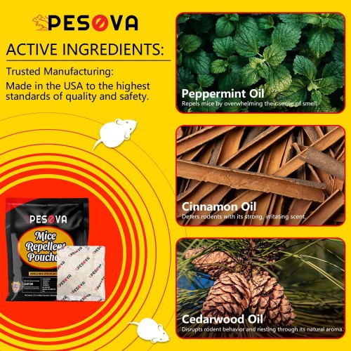 - 🌿 1. Natural Essential Oil Formula:Formulated with Peppermint Oil (3%), Cinnamon Oil (1.5%), and Cedarwood Oil (1.5%), our pouches deliver a powerful scent rodents hate—without toxic chemicals or harsh ingredients.