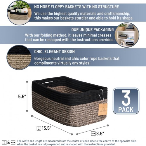 NaturalCozy 13.5”x8.5”x5.5” Rectangle Storage Baskets for Shelves 3 Pack | Cotton Rope Woven Small Baskets for Organizing | Small Storage Bins for Nursery, Bathroom, Closet, Shelf, Decorative