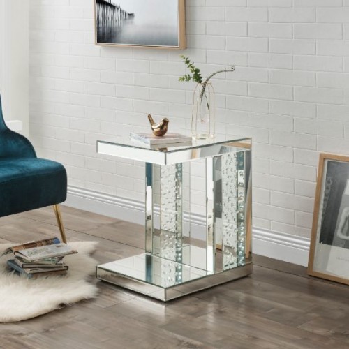 Go full glam with this Nysa Accent Table. The clear mirrored table top and glistening faux crystals inlay will reflect light and make any room appear larger. It provides a spacious table top ample enough for displaying various decor items while the unique base gives the table a stylish and sturdy support. The Nysa Accent Table is truly a statement piece for any space. Use in any room to enhance your decor.