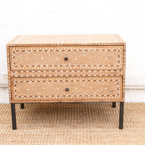 This piece represents the perfect marriage of history and modern utility. Originally crafted as a traditional antique dowry chest or travel trunk, it has been thoughtfully re-imagined by De-cor. We preserved the original intricate inlay work but solved the “usability” problem by converting the fixed front panel into two functional drawers. We then mounted the entire chest on a custom-welded iron stand, giving it height and an airy, floating presence. Measuring 35″ x 21″ x 27″H, this piece retains all the charm of the original artifact. The surface is covered in a delicate “speckled” inlay pattern, framed by bold geometric borders. The new drawers offer practical storage for bedside essentials without needing to clear the table top to open a lid. The sleek black metal stand provides a contemporary contrast to the warm, aged wood, blending the old