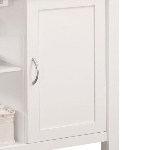 - Design and Storage: The kitchen cart features a wooden top with a sleek black finish, complemented by a white body. It includes one door with an internal shelf, one storage drawer with a center metal glide, and two open shelves for versatile storage options.