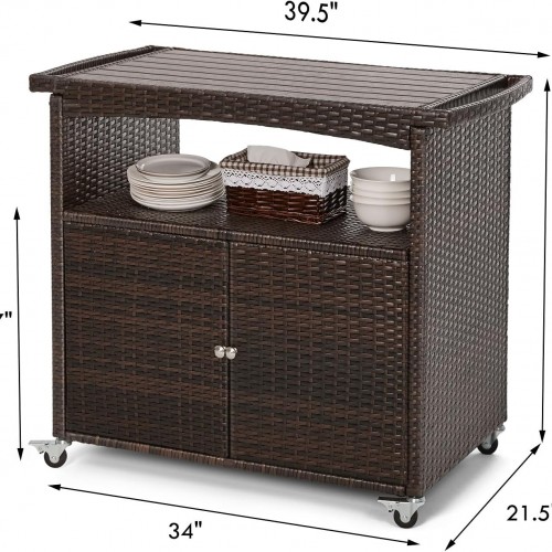 - 【All Weather Wicker & Heavy-Duty Construction】Outdoor sideboard is constructed from double sided galvanized steel metal frame with strong powder-coating, makes this cabinet more sturdy and durable, hand-woven wicker in espresso brown is built to last while having a sleek and stylish finish, our patio bar cart is assembly required, easy-to-follow instructions, hardware and tools included, overall dimensions: 39.5”L*21.5”W*34”H