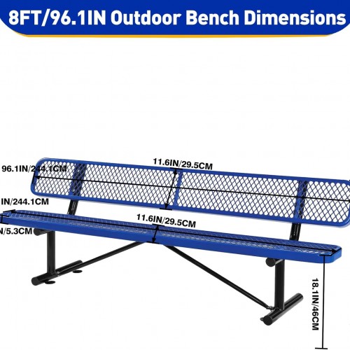 Outdoor Garden Bench, Cast Iron Metal Frame Patio Park Bench with Backrest, Portable Expanded Metal Black Bench, Commercial-Grade Outdoor Seating for Lawn, Patio, Park, Yard, Garden (Blue, 8FT/96”)