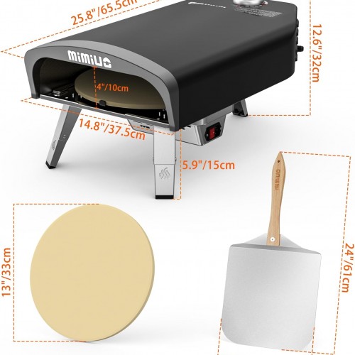- 【Perfect Pizza Grilling Oven Kit】- It comes with the gas pizza oven with inner turntable, a 13″ round pizza stone, a pizza peel and an oven cover.