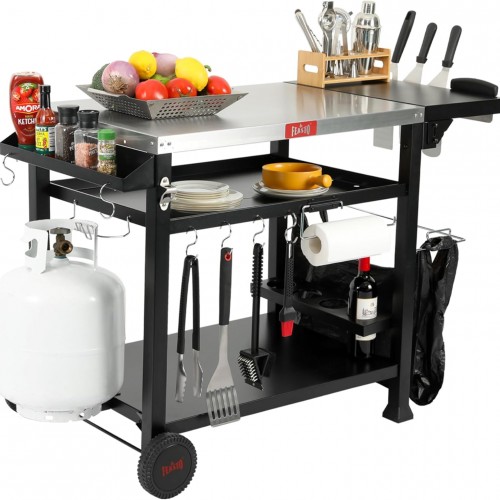 Outdoor Grill Cart, Pizza Oven Table Stand for Outdoor Indoor, 40″ x 26″ Stainless Steel Tabletop Dining BBQ Grill with Wheels for Food Prep, 3-Shelf Kitchen Cart Table
