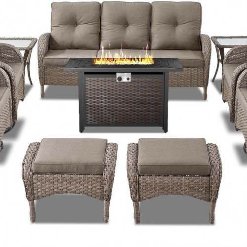 Outdoor Patio Furniture Set with 50000BTU Propane Fire Pit Table, 4 Pieces Wicker Patio Conversation Set with 2 Swivel Rocker Glider Chairs Rattan Sofa Blue Cushion Perfect for Casual Gathering
