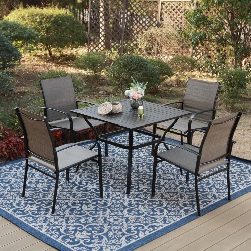 - Premium Material: Metal dining table, thick slatted metal table top, rust and weather resistant. Powder-coated matte finish, UV resistant and easy to clean with a damp cloth. Non-slip feet are suitable for uneven ground and prevent floor scratches
