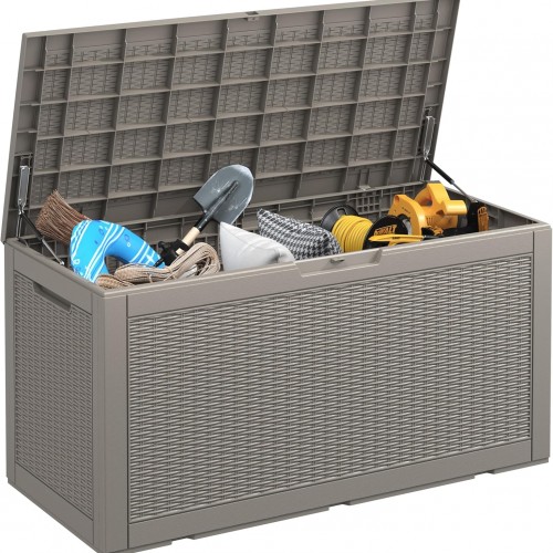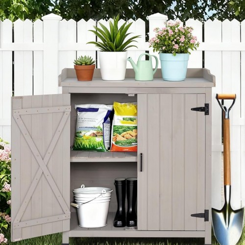 Outdoor Storage Cabinet with Metal Work Top|Waterproof Wooden Potting Bench|Spacious Patio Cabinet with Raised Side Rail for Garden Tools, Backyard,Lawn Gardening|Gray Outdoor Cabinet