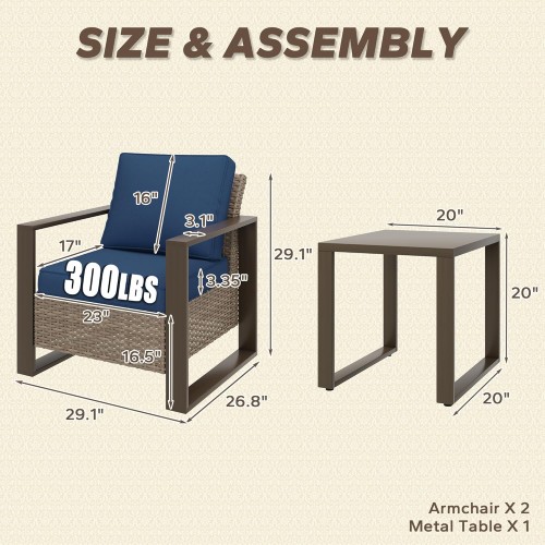 - COMPLIMENTARY SIDE TABLE: This wicker chair set comes with an aluminum side table with stylish look, which is an ideal addition to the patio chairs.