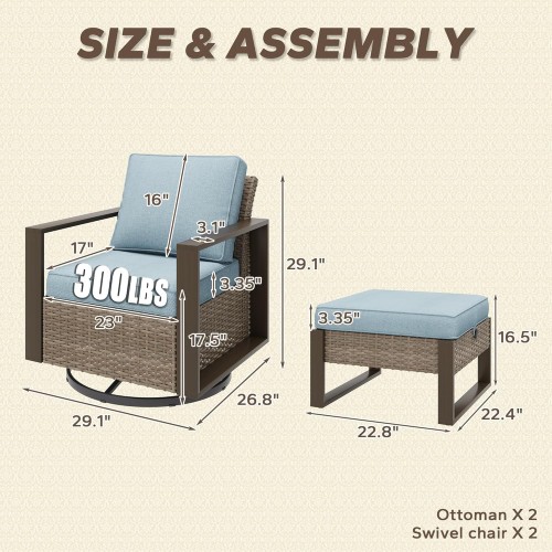 Outdoor Wicker Metal Chairs Set of 2 with Two Ottomans, 360 Degree Glider Rockers Armchairs, 4 Pieces Patio Bistro Set with Wood-Looking Metal Armrest for Poolside, Terrace, Baby Blue