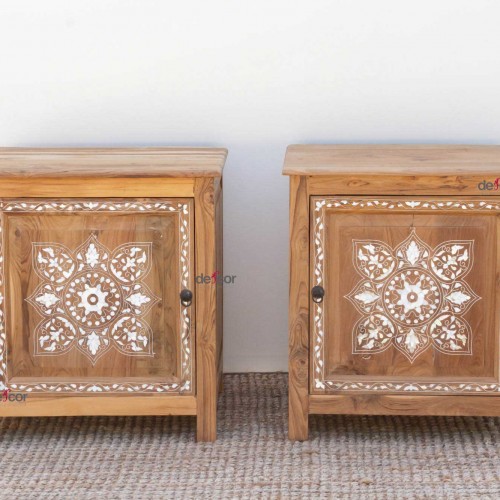 Reconstructed from reclaimed teak and adorned with genuine sea mother-of-pearl, these pieces boasts an elegant floral and leaf medallion inlay, reminiscent of the city’s historic inlay tradition. Damascene inlay, a centuries-old craft, once used exotic materials reflecting its status as a major trade route. Today, shimmering mother-of-pearl takes center stage, adding a touch of luxury. Featuring intricate an inlay door with simple iron ring handles and resting on sleek legs, these nightstand cabinets offers both functionality and captivating beauty. The natural bleached teak showcases its beautiful grain and texture, creating a stunning contrast with the luminous inlay.