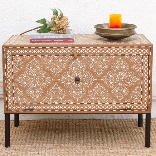 These Artisan Drum Tables are masterpieces of the “curved canvas.” unlike flat tables, inlaying a cylindrical surface requires a master’s touch, as every piece of bone must be shaped to follow the arc of the wood. This pair features a mesmerizing “Ogee Leaf” pattern on the sides that draws the eye upward to a stunning central medallion on the top. Perfectly scaled at 14″ diameter x 19″ height, these gems are designed to move with your life. The rich brown walnut tone provides a warm, grounding backdrop for the thousands of white inlay pieces, creating a shimmering effect that changes with the light.