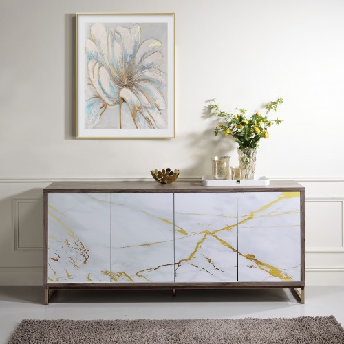 - Versatile Design: This elegant console cabinet is offered in two distinct color styles: White Marble Paint with Oak & Champagne accents, and White Marble Paint with a sleek Chrome Finish, making it adaptable to various interior designs.
