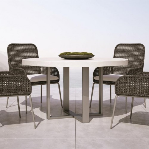 The Paradise Outdoor Dining Table dining table features a round cast concrete top in Bone finish and a stainless steel base finished in flint gray. Clean lines and a neutral palette combine for an enduring modern look that can withstand the elements.