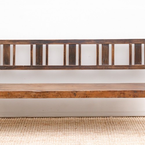 This charming antique slat-back bench, approximately 72 inches long, is crafted from durable teak wood and likely originates from the Dutch Colonial period in Ceylon. This Early- Mid 20th century bench features a classic design with a slatted backrest, a solid plank seat bearing a warm patina, and gently curved armrests. The rich, patinated brown finish enhances the natural beauty and grain of the teak, a wood prized for its strength and resistance to the elements.