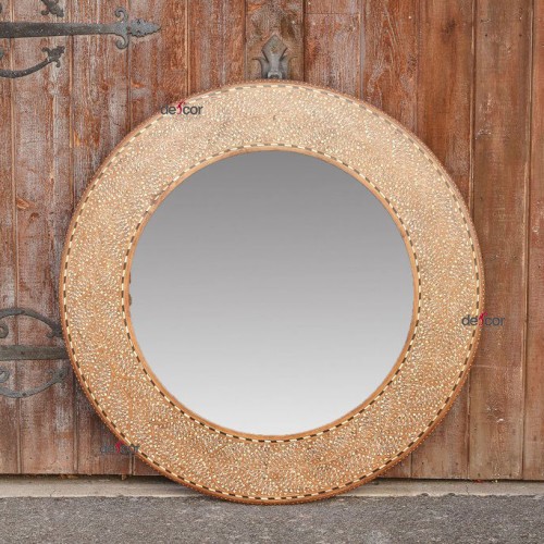 A masterful Anglo Indian teak mirror made from reclaimed teak wood . This beautiful round mirror is all inlaid by hand and adorn with beautiful open leaf inlay designs and motifs all around. This lovely wall art piece has a brown walnut finish contrasting the white inlay design.