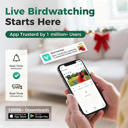 - 【Advanced AI Identification,Instant Alerts & Solar Powered】: Our built-in AI technologyinstantly recognizes over 10,000 bird species, helping you learn about your feathered friends.Compatible with 2.4GHz Wi-Fi, this smart bird feeder camera ensures seamless connectivity and receives instant alerts upon bird arrivals.Powered by a robust 5200mAh rechargeable battery and an efficient 3W solar panel, enjoy long-lasting. (Includes free 1-month AI trial)