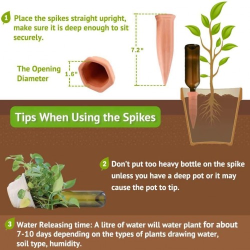- [HUGE TIME SAVERS & PLANTS HELPERS] Terracotta watering spikes work through osmosis.The porous material prevents the water from pouring out of the bottles when plant watering spikes are inverted,and yet allows the water to seek through slowly.The wetter the soil, the slower the seep.As the soil dries, the water seeps out through plant watering devices. Your plants can be dispensed the appropriate amount of water and no overflow means they won’t lose any soil or nutrients to grow healthier