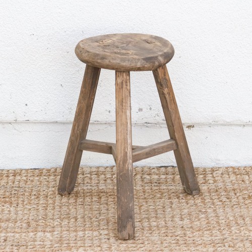 A rustic beauty, this weathered wooden round stool isn’t just furniture; it’s a whisper of the past. From the early 20th century, this round stool has aged gracefully, acquiring a beautifully textured finish that speaks volumes about its journey.Deceptively simple in its form, this stool showcases the ingenuity of traditional Chinese carpentry. Its three splayed legs aren’t merely supports; they’re an intriguing display of joinery. Interlocking stretcher bars form a central triangle, adding stability and a touch of design magic to the otherwise unadorned structure. Add this antique piece as an occasional stool, a charming end table or a rustic pedestal for a plant stand.