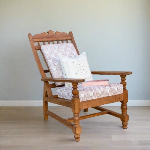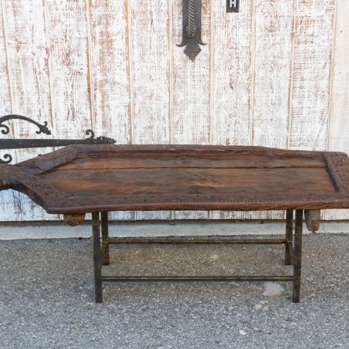 Originally from the Swat Valley, this mihrab shaped panel was used as a prayer board for women and was to placed on the floor and pointed towards Mecca. It features a geometric carved border and a dark waxed patina. Great to use as wall or as a table top. Comes with an added custom iron stand to be used as a coffee table.