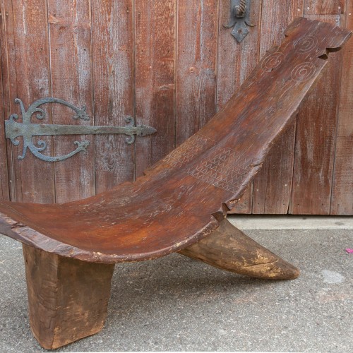 A lovely artifact, this primitive chair was carved for the “Noble” in the Lobi tribe. This piece is beautifully carved from a large log of wood. This chair sits low to the ground and is an example of African primitive yet aesthetic design. It features three robust cone shaped legs with a stylish carved design. Ideal for use a lounge chair indoor or outdoor or as statement accessory in a room. Please note: chair is an antique is slightly uneven.