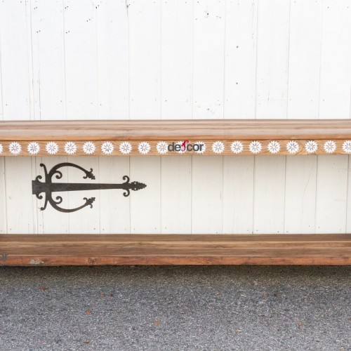 A charming console table with thick square legs and a lower shelf. Made from reclaimed teak, this large reconstructed table has natural reclaimed teak finish with a beautiful inlay work in a floral motif. This table features blossom inlay designs across all the apron on all sides of the table. This table has four square legs and lower shelf. Our blossom mother of pearl inlay collection is inspired by the opening of a lotus flower which is a symbol of purity and enlightenment. This reclaimed teak table is hand-carved forming the flower shape, the inlay pieces are cut and carefully hammered into the wood to create the lovely lotus design.