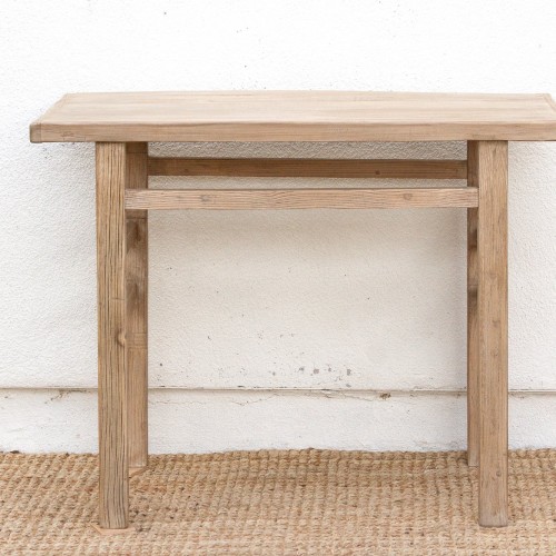 This is a piece where form meets spirit. Reconstructed from old wood, this altar console table carries with it the quiet gravitas of its past life. The rustic bleached finish reveals a charming, inviting grain, with every knot and imperfection telling a part of its story. Its timeless, elegant silhouette, with clean lines and a simple form, pays homage to the traditional altar tables of the past.