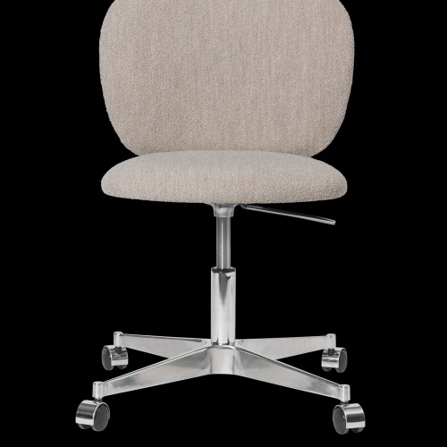 The Rico Collection welcomes curves and volumes into a classic design defined by soft lines and an embracing expression. Guided by an ever-present sense of contrast, the Rico Chair with Castors juxtaposes the refinement of chrome against the timeless yet comfortable warmth of soft bouclé upholstery. This versatile chair features castor wheels for easy mobility and an integrated pump for effortless adjustability. Its subtly understated backrest enhances the minimalist aesthetic, providing a refined and cosy feel.