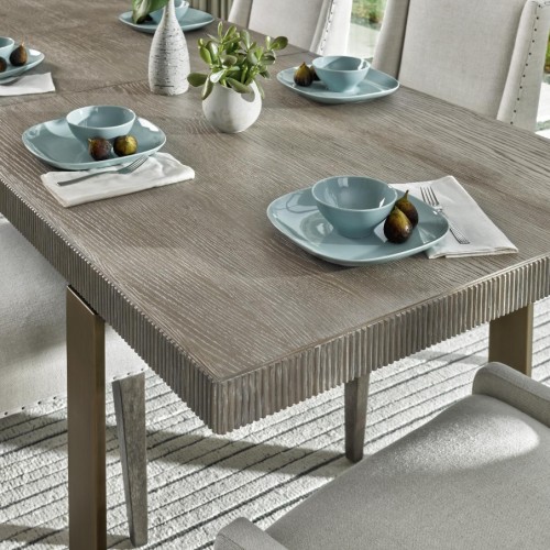 The Robards Rectangular Dining Table artfully juxtaposes a lustrous bronze base against a delicately ridged, matte-finished wood, creating a bold dining room statement piece.
