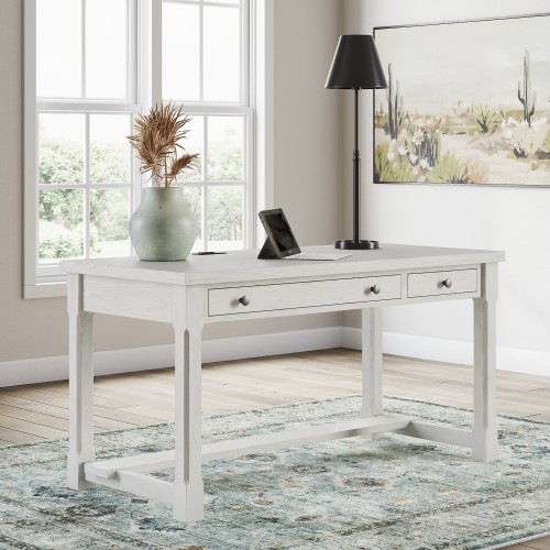 This home office desk is sure to impress when it’s time to study or work from home. With its antiqued white finish and wood grain texture, modern farmhouse-style workstations have never been so fashionable. A wide keyboard drawer and convenient USB charging bring function galore to your at-home office. Use this piece as a stand-alone work area, or pair it with the matching desk return (sold separately) to expand your workspace. All that’s missing is you.