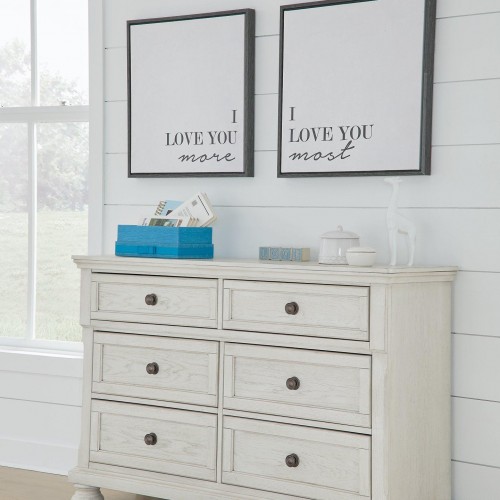 Elegant, timeless furnishings take your bedroom to the next level. Nothing does that better than this dresser. The antiqued white finish with a wonderful grain texture radiates sophistication, while dark bronze-tone knobs add an ornate touch. Felt finishing in the upper drawers rounds out this tasteful piece.