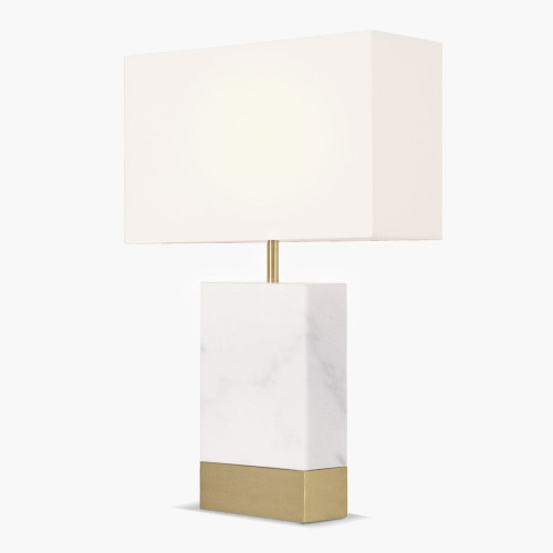Our Roma table lamp pairs a wide swath of smooth white marble with an accent of brushed brass detail and a crisp white shade for a sleek and sophisticated lighting offering.