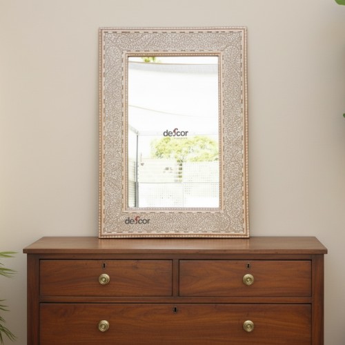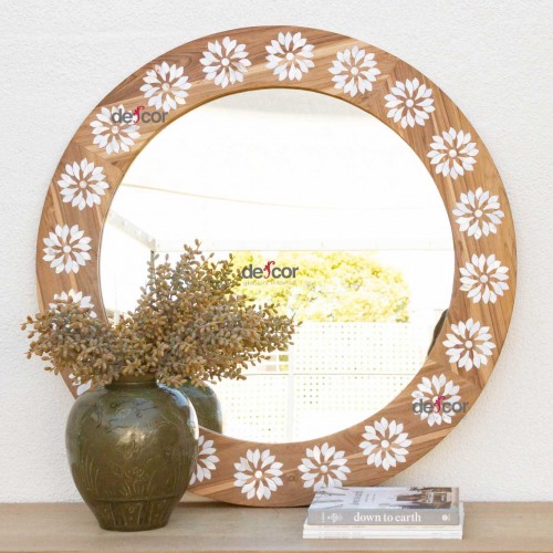 This beautiful boho modern mirror would be a staple in any home. Our blossom mother of pearl inlay collection is inspired by the opening of a lotus flower which is a symbol of purity and enlightenment. The reclaimed teak is hand-carved forming the flower shape, the inlay pieces are cut and carefully hammered into the wood to create the lovely lotus design.