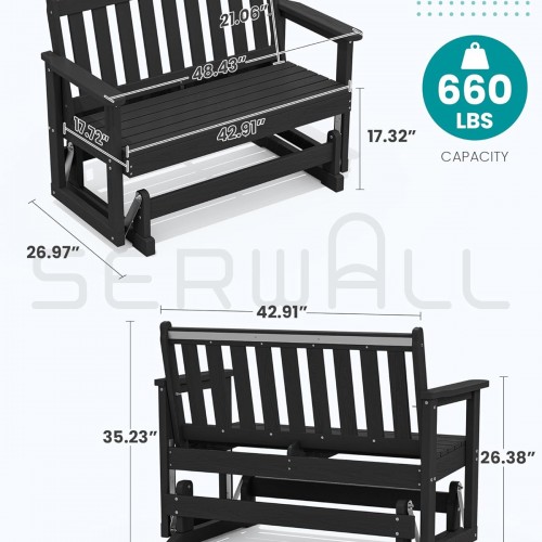 SERWALL 2 Person Patio Glider Bench, HDPE Material Weather-Resistant Swinging Bench for Outdoor Porch Garden, Black