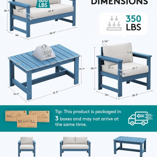 - What will you get: 2 outdoor single-seater sofas with khaki cushion, a outdoor loveseat with khaki cushion, as well as a outdoor coffee table, which will be shipped in THREE packages. Enjoy SERWALL 4-piece patio conversation set that’s built to last, offering a comfortable and stylish space for relaxation and conversation.