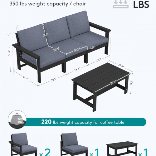 SERWALL HDPE Patio Sofa Set, 4-Piece Sectional Outdoor Furniture Set, All Weather Outdoor Couch Set Patio Furniture Set for Deck, Lawn, Black Frame with Grey Cushion