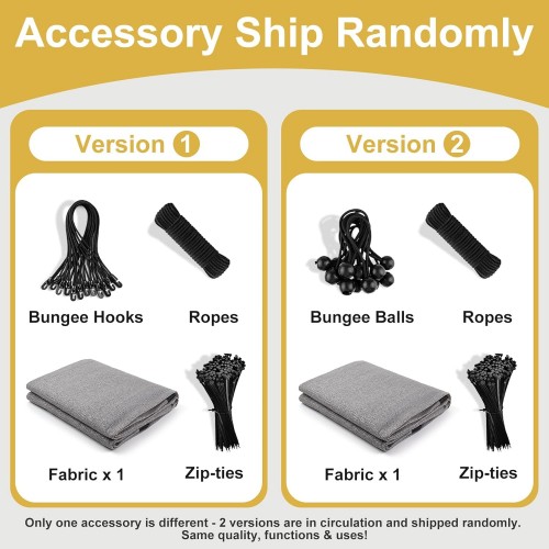 - Accessory Updated: Accessories have been updated from [Zip-ties, Ropes, Bungee Balls] to [Zip-ties, Ropes, Bungee Hooks]. Both versions are in circulation and will be shipped randomly. Easy to Install: With included grommets on each sides every 2 ft space and fixing accessories, you can easily attach the pergola shade cover to various structures while ensuring uniform stress. Whether you’re looking to cover your backyard, carport, or playground, you can have it up and providing shade in no time