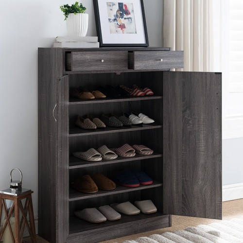 Shoe Cabinet, Two Door Storage Cabinet With Two Drawers, Fits 15 Pair Of Shoes – Distressed Gray