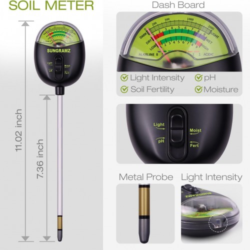 - All-in-One Soil Monitoring Tool: Designed to test soil moisture, pH level, sunlight intensity and nutrient content, this soil pH tester helps optimize plant health by giving you clear insights into soil conditions for smart, streamlined use