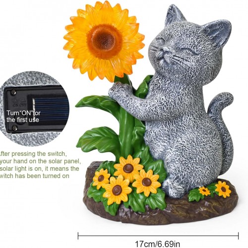 - Cute Solar Garden Decor: This charming resin cat statue cuddles a vibrant sunflower with a built-in solar panel. After 5-6 hours in sunlight, it automatically emanates a soft, warm light for 6-8 hours at night, creating a magical and cozy atmosphere