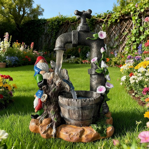 - Design & Function: Features whimsical garden gnomes interacting with an solar fountain faucet, paired with a glowing LED “water stream.” Blends artful solar garden decorations with functional solar garden light tech, doubling as eye-catching lawn ornaments and unique yard solar lights.