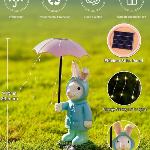 - Unique Design:Our rabbit statue blend art and nature in perfect harmony. Bunny with a glowing umbrella sparkles with childlike wonder. Its playful stance invites you to rediscover life’s simple pleasures, turning ordinary nights into magical moments under the starry umbrella glowadding profound meaning to all kinds of decorations.Size:4.13×3.54×9.25 inches. Weight: 0.99 pounds