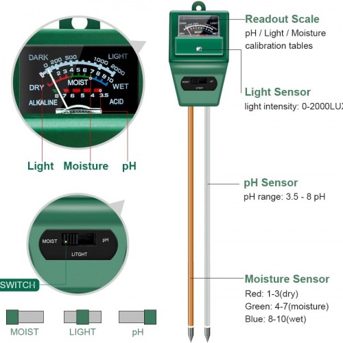 - 3 METERS IN ONE: Soil moisture level, Soil pH value and Sunlight level could be tested easily according to your need by switching the function button of this soil meter.