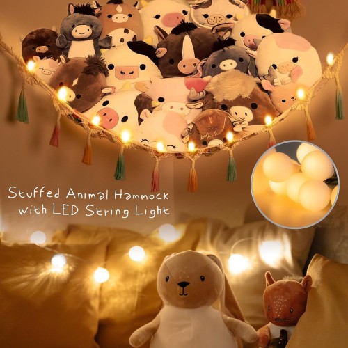 Stuffed Animal Net or Hammock with Light,Yewiwin Macrame Hanging Net Hammock for Stuffed Animal Toy Storage Organizer Boho Decor Room Holder for Nursery Play Room Bedroom (Beige(55″*55″*72″))